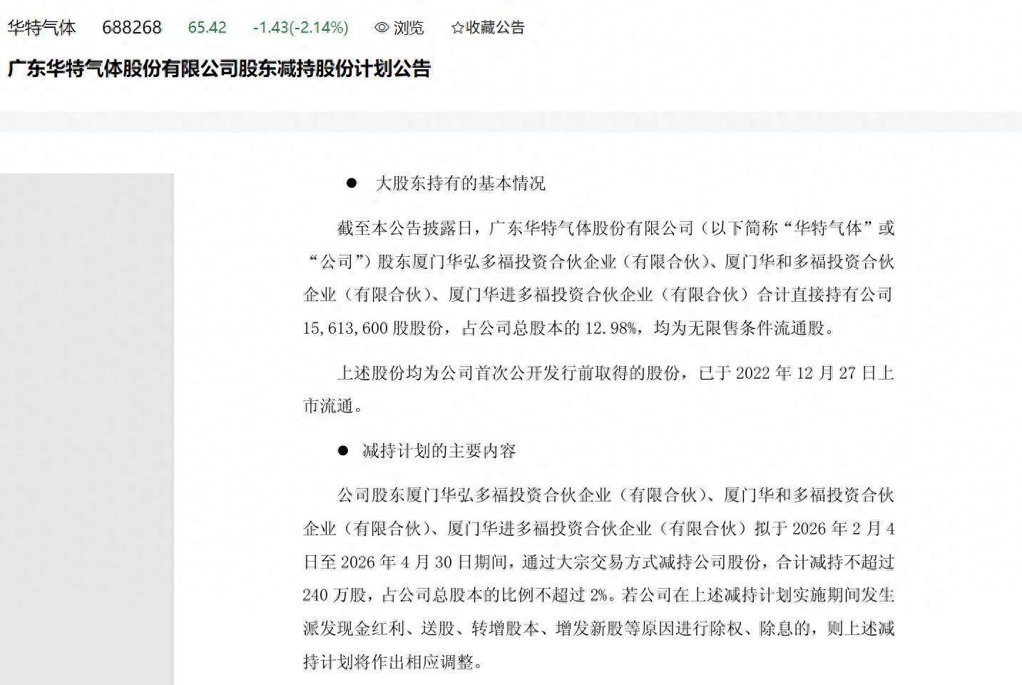 来自华特气体公告华特气体实控人的一致行动人股东于1月12日披露了240万股的减持计划,时间为春节后至年报披露季的敏感窗口期,按最新收盘价估算接近1.6亿元,这是最近一年来上述股东的第三轮减持。财报显示,公司去年前三季度营收与净利双降。